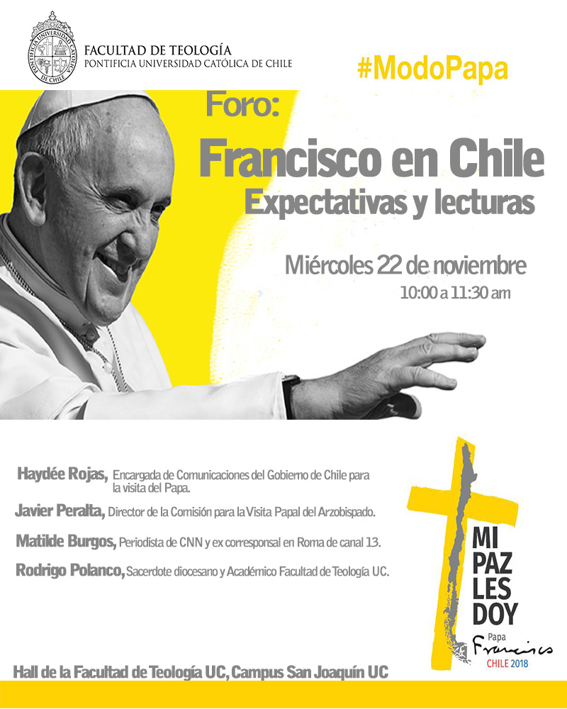 En este contexto, la Facultad de Teología UC realizará el foro Francisco en Chile: Expectativas y lecturas, el miércoles 22 de noviembre en el Hall de la Facultad, en el Campus San Joaquín UC (Vicuña Mackenna 4860, Macul).