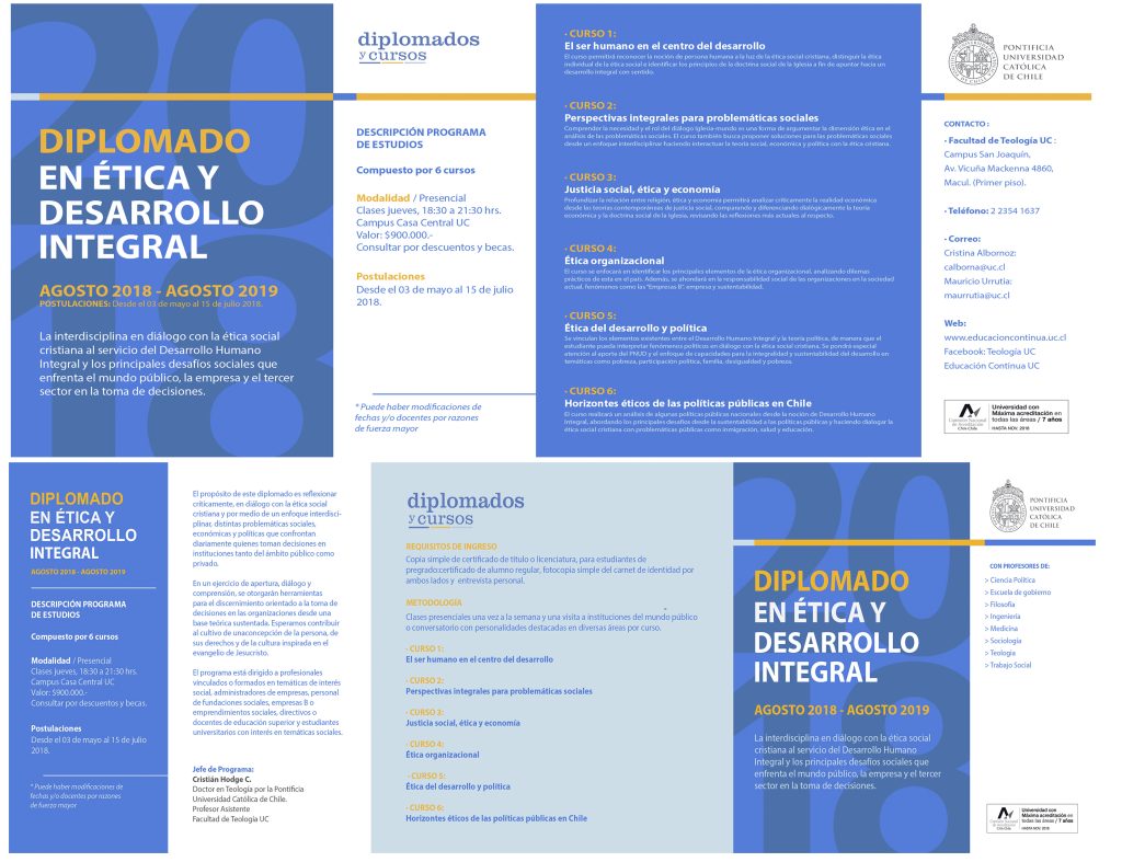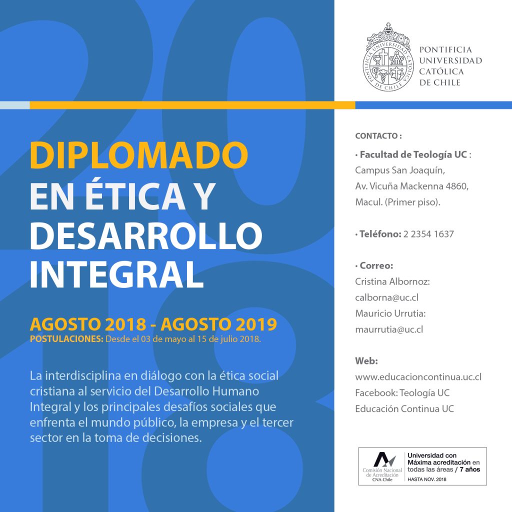 Desde esta semana están abiertas las postulaciones al nuevo Diplomado en Ética y Desarrollo Integral de la Facultad de Teología UC, que se impartirá desde agosto de 2018, en la modalidad presencial de 6 cursos, a cargo de un equipo interdisciplinario de profesores de diversas facultades de la Pontificia Universidad Católica de Chile, junto a docentes invitados externos, cuyos conocimientos y experiencia contribuyen al desarrollo conceptual del programa.