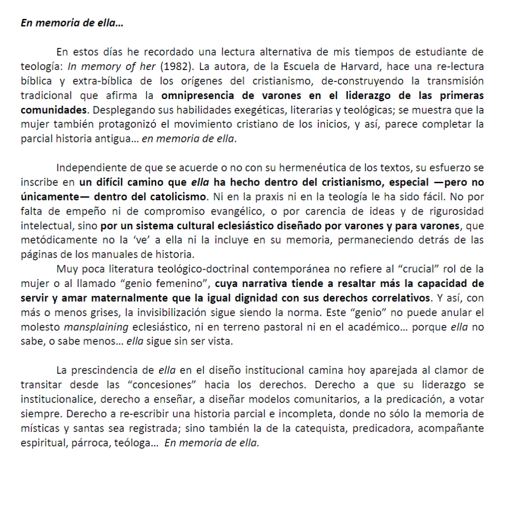 Día de la Mujer: “En memoria de ella” por Dra. Sandra Arenas