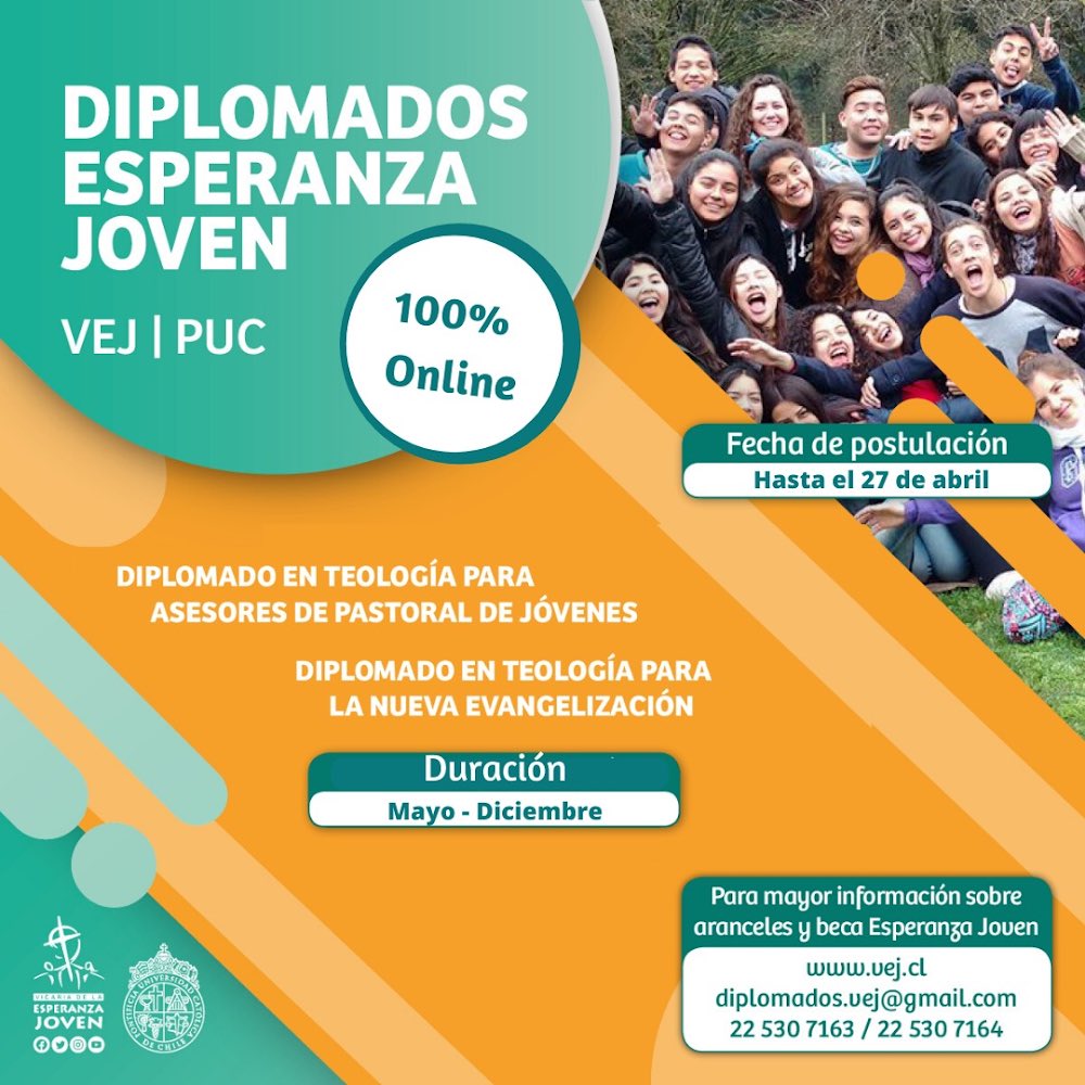 La Vicaria de la Esperanza Joven en conjunto con la Pontificia Universidad Católica de Chile, tienen el agrado de invitar a la tercera versión del Diplomado en Teología para Asesores de Pastoral de Jóvenes. Este diplomado pretende explorar de manera integral el rol del asesor de pastoral de jóvenes en la vida de la Iglesia, poniendo especial énfasis en la formación teológica como un aporte conceptual clave, que favorezca la reflexión y que, apoyado de herramientas metodológicas y pedagógicas, contribuyan a un quehacer pastoral de mayor significado.