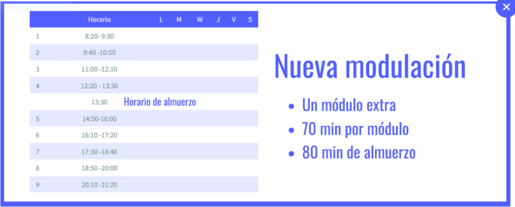 Este cambio agregará un módulo más de clases al día, pasando de ocho a nueve disponibles para el trabajo en aula, talleres y laboratorios. Tal como señala Gonzalo Pizarro, director académico de Docencia, “hay estudios que evidencian que se logra una mayor atención en las clases de la mañana. Así, se ha agregado un módulo en esta franja horaria, lo que fomentaría la atención en clases”. Además, con este cambio se extiende el horario de almuerzo en 10 minutos, lo que facilitará el traslado entre los campus de Santiago y permitirá la extensión de un periodo que es ampliamente utilizado por los estudiantes para descansar, socializar y desarrollar actividades extracurriculares y co curriculares.