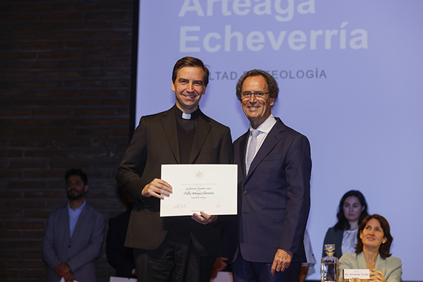 Por su parte, el profesor Pablo Arteaga Echeverría, galardonado en la categoría Iniciación, expresó su alegría por un reconocimiento que no solo valora el esfuerzo individual, sino también el trabajo conjunto de la Facultad:“Es una tremenda alegría y un honor y un privilegio haber recibido el premio a la excelencia en docencia, que creo que es un premio no solo para la persona de quien lo recibe, sino para todo el equipo de nuestra Facultad de Teología, que con gran esfuerzo y dedicación día a día nos entregamos para dar una educación de excelencia.”