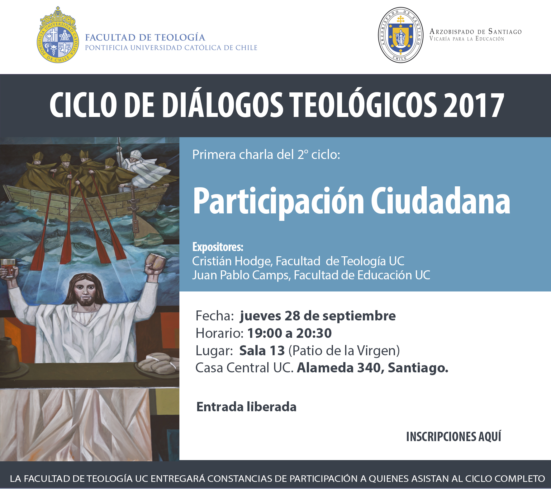El jueves 28 de septiembre, comienza el 2° Ciclo de Charlas Teológicas 2017, con el dialogo que abordará el tema “Participación Ciudadana”.