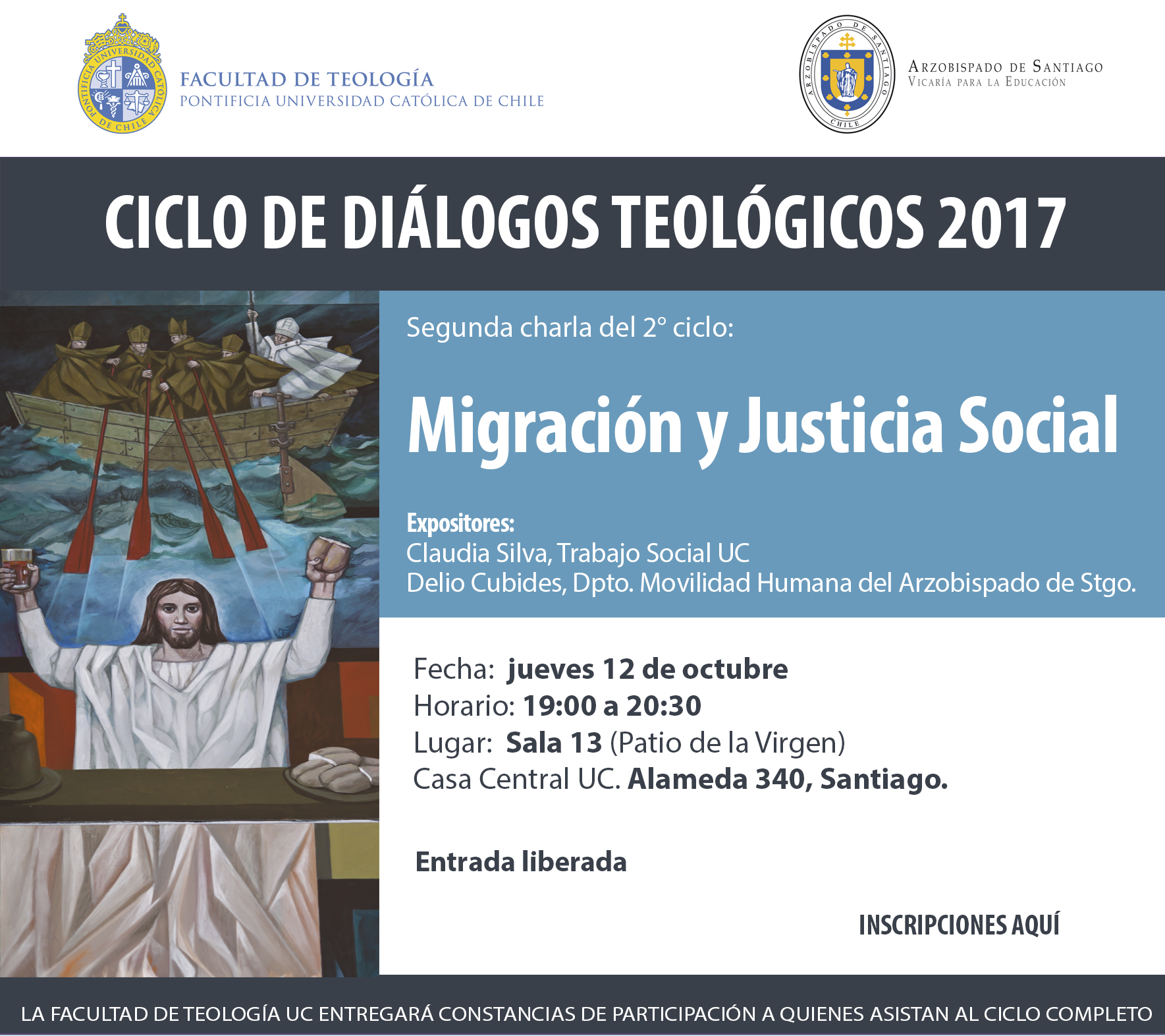 El jueves 12 de octubre, ser realizará la charla “Migración y Justicia Social”, que corresponde a la segunda del Ciclo 2 de 2017 de los Diálogos Teológicos, que son una instancia de reflexión y debate que nació en colaboración con la Vicaría para la Educación del Arzobispado de Santiago y cuyo objetivo es actualizar y perfeccionar a los profesores de Religión en temas teológicos.