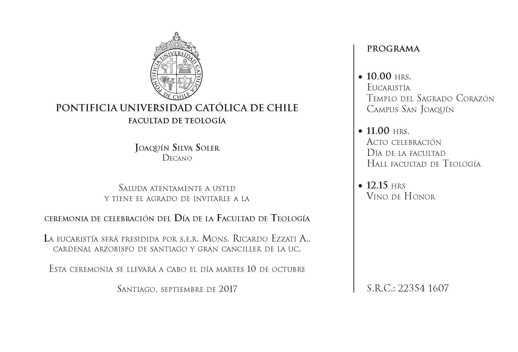 El martes 10 de octubre se realizó la celebración del día de la facultad de Teología de la Pontificia Universidad Católica de Chile, que iniciaó con la Eucaristía que será presidida por S.E.R. Mons. Ricardo Ezzati A., Cardenal Arzobispo de Santiago y Gran Canciller de la UC.